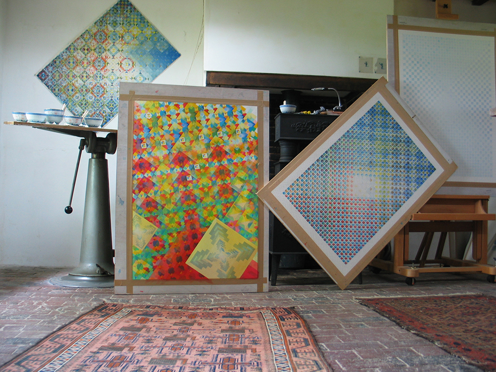 Joshua Janssen start veelal met een dwingend grid als oneindig open begin. Dan komt het werk in aquarelverf van kleur, licht, vorm en ruimte. Zijn schilderen is een proces van neerzetten, weghalen en weer aanbrengen, doorbreken en verbinden. Een spel van mogelijkheden met steeds nieuw te volgen sporen, horizontaal, verticaal, diagonaal, leegte of volume, het vierkant... Het zien is leidend. Aan het eind hiervan staat een onnavolgbare eenheid van vorm en kleur. |